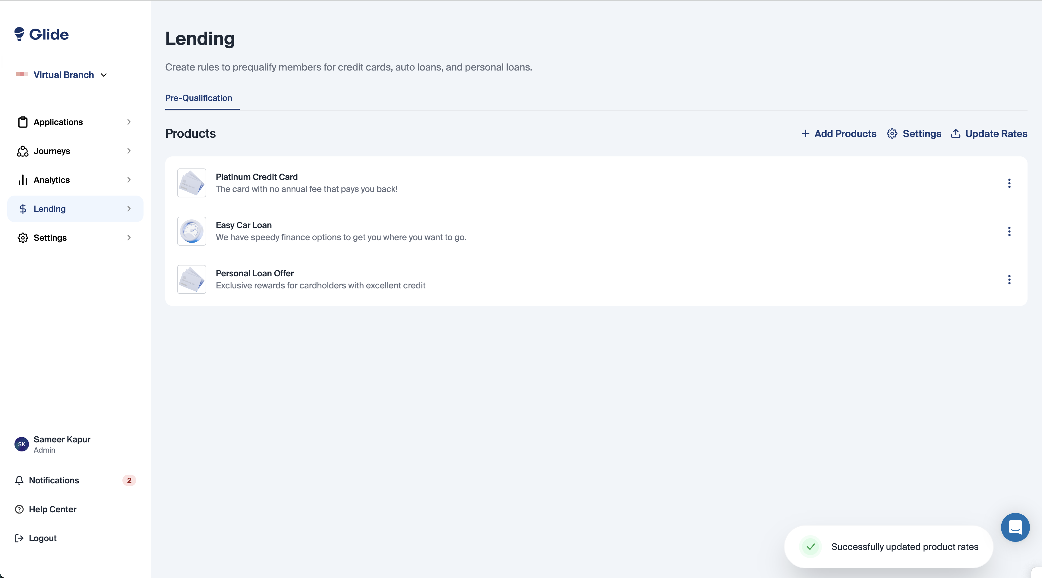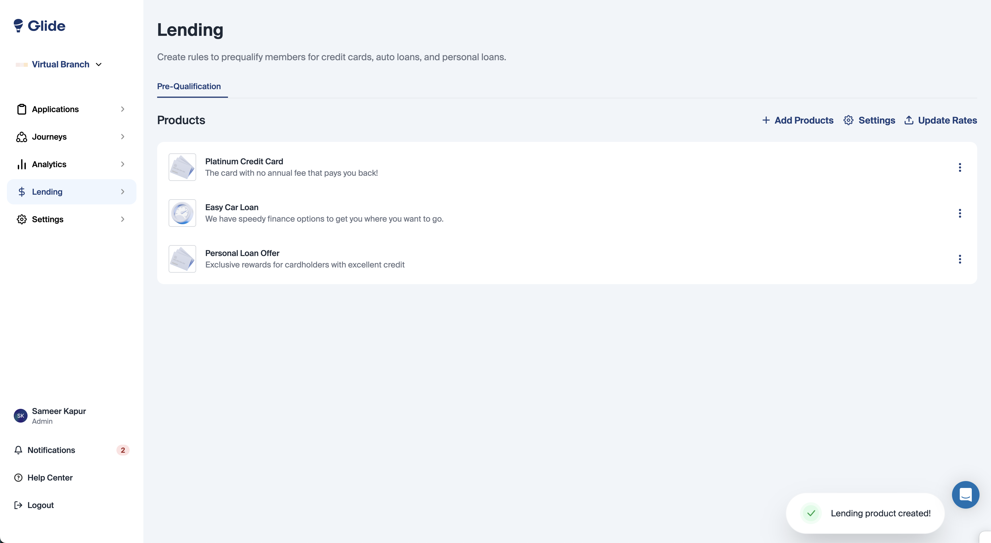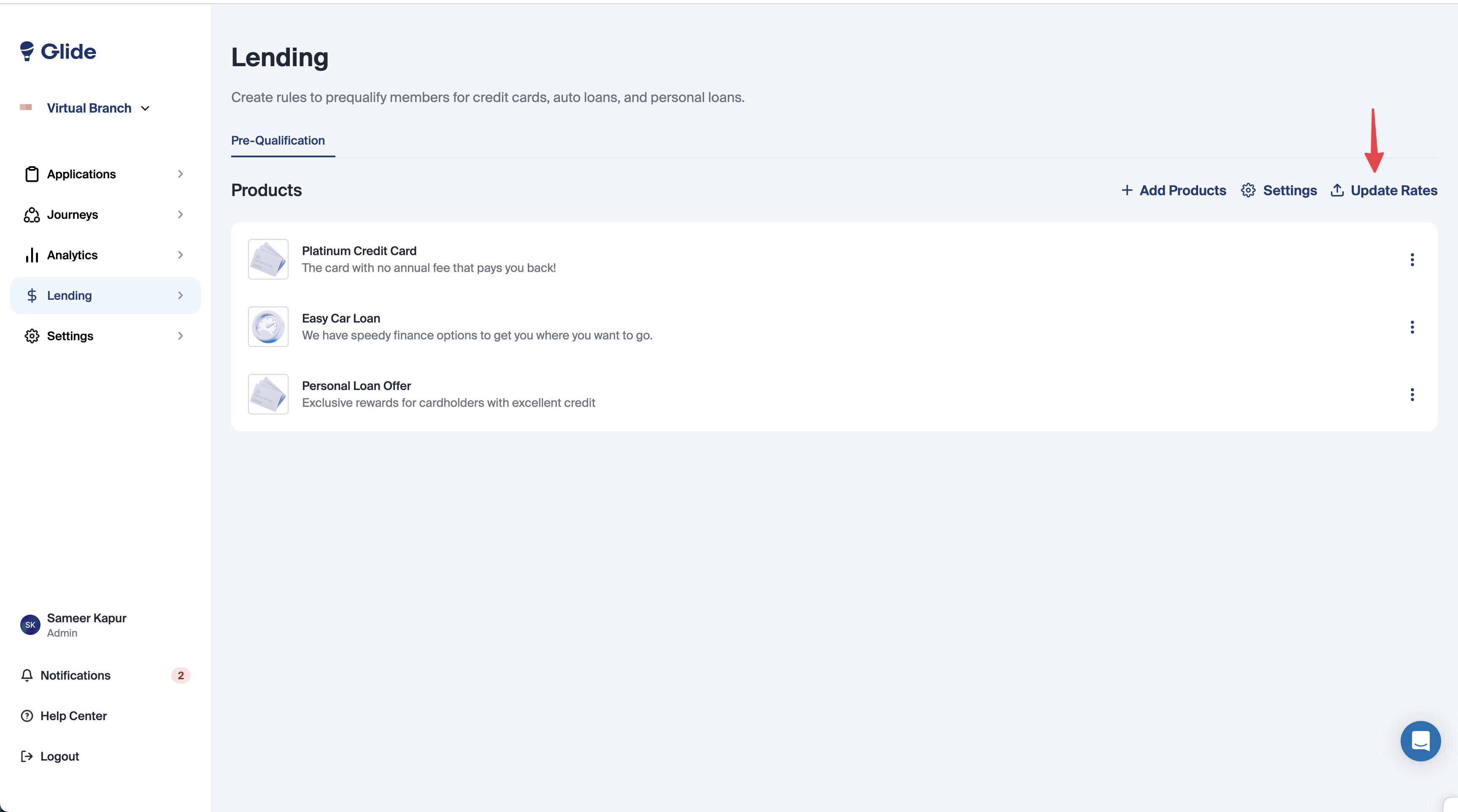 In this guide, you'll learn how to add and update lending products and rates on Glide's staff dashboard.
