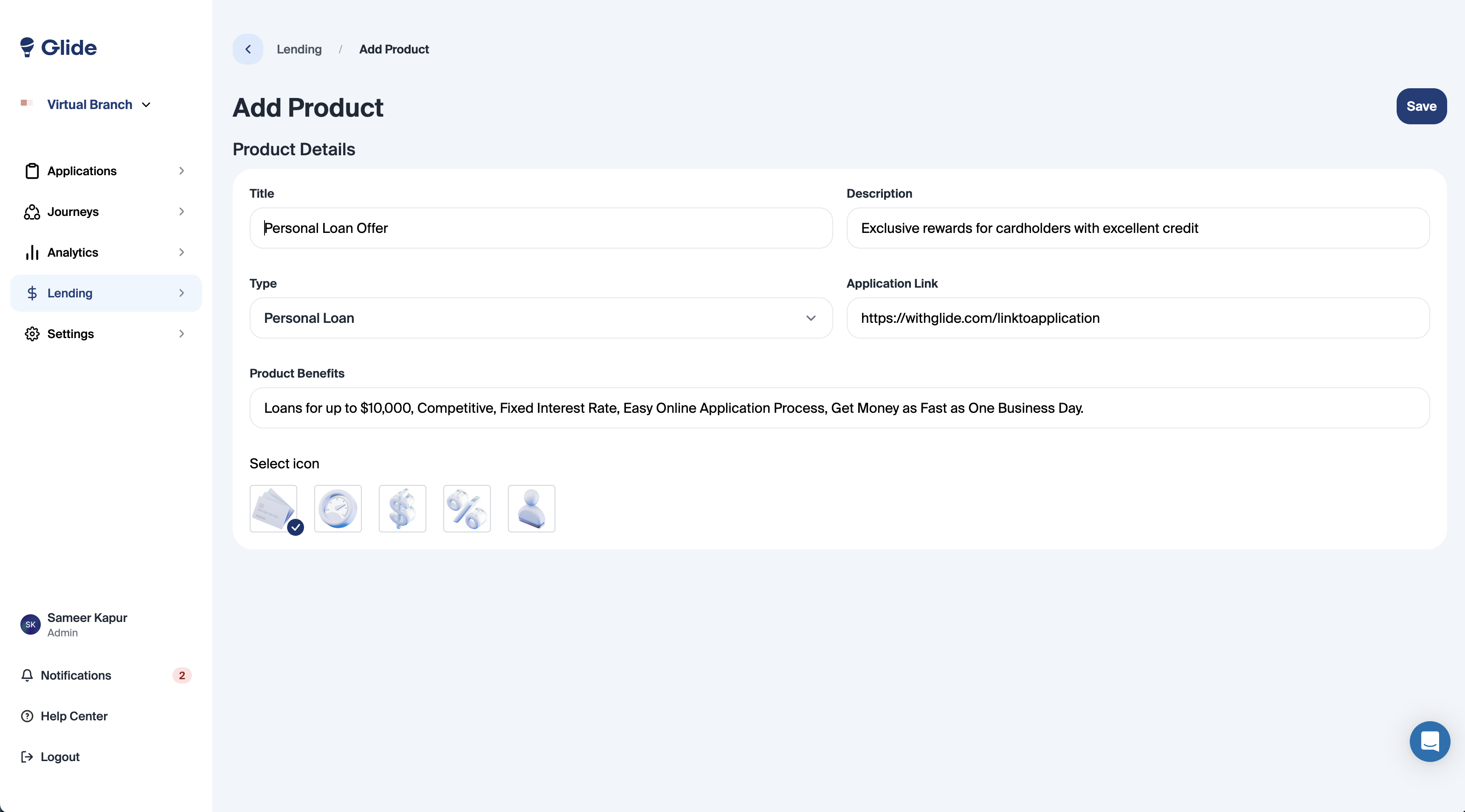 Fill in title, description, type, application link, benefits, and icon for the loan product you would like to add. Then click "Save."