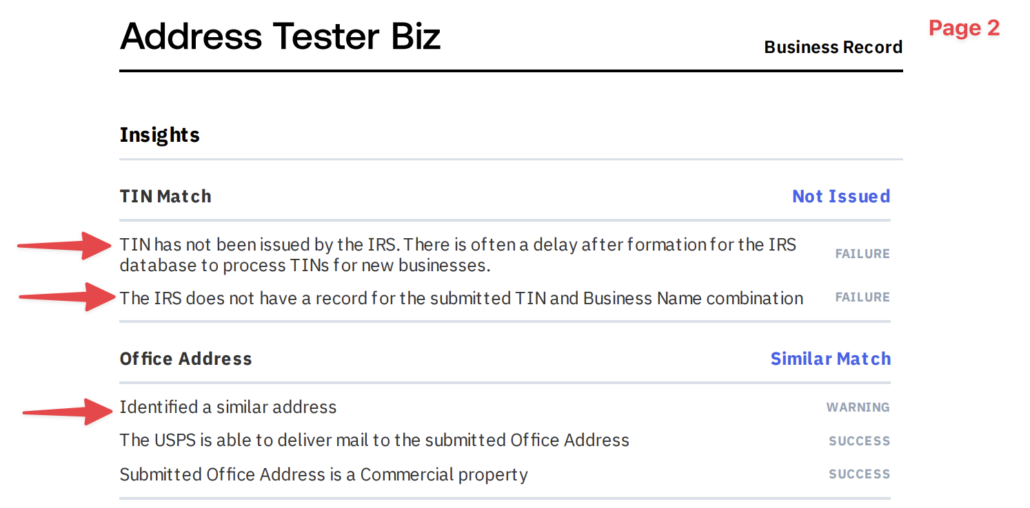 Recourse: Notify the applicant of the failure to verify the office address and request comprehensive proof of address that associates the business with the name/TIN. Acceptable documents may include a recent commercial lease agreement, mortgage statements for the property, or confirmation of address service from a recognized postal authority.