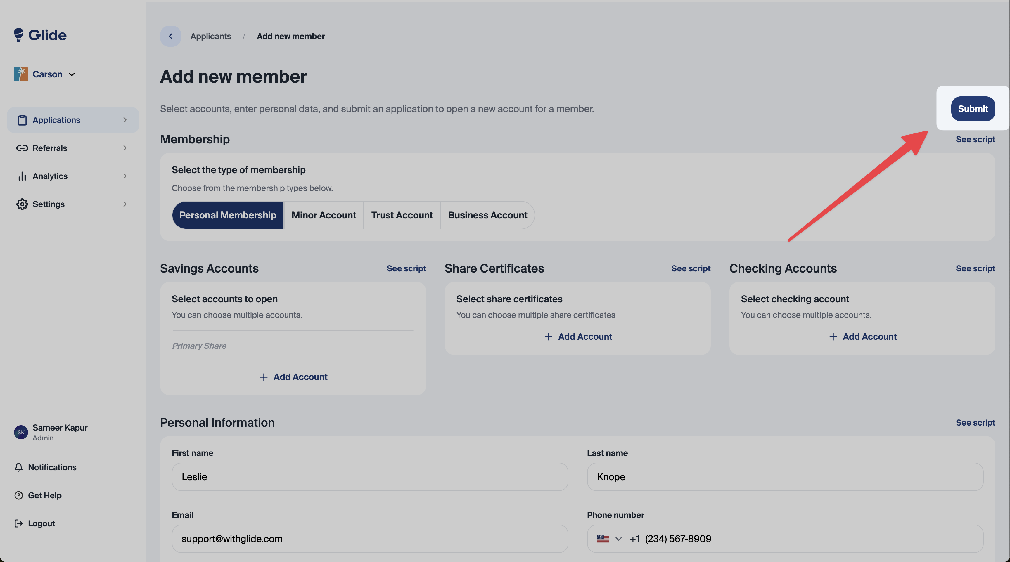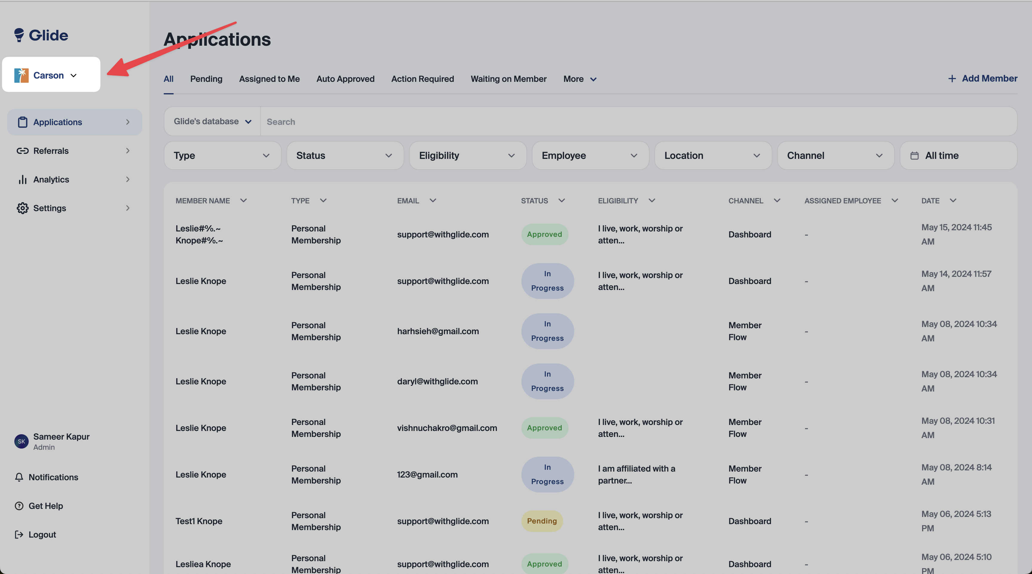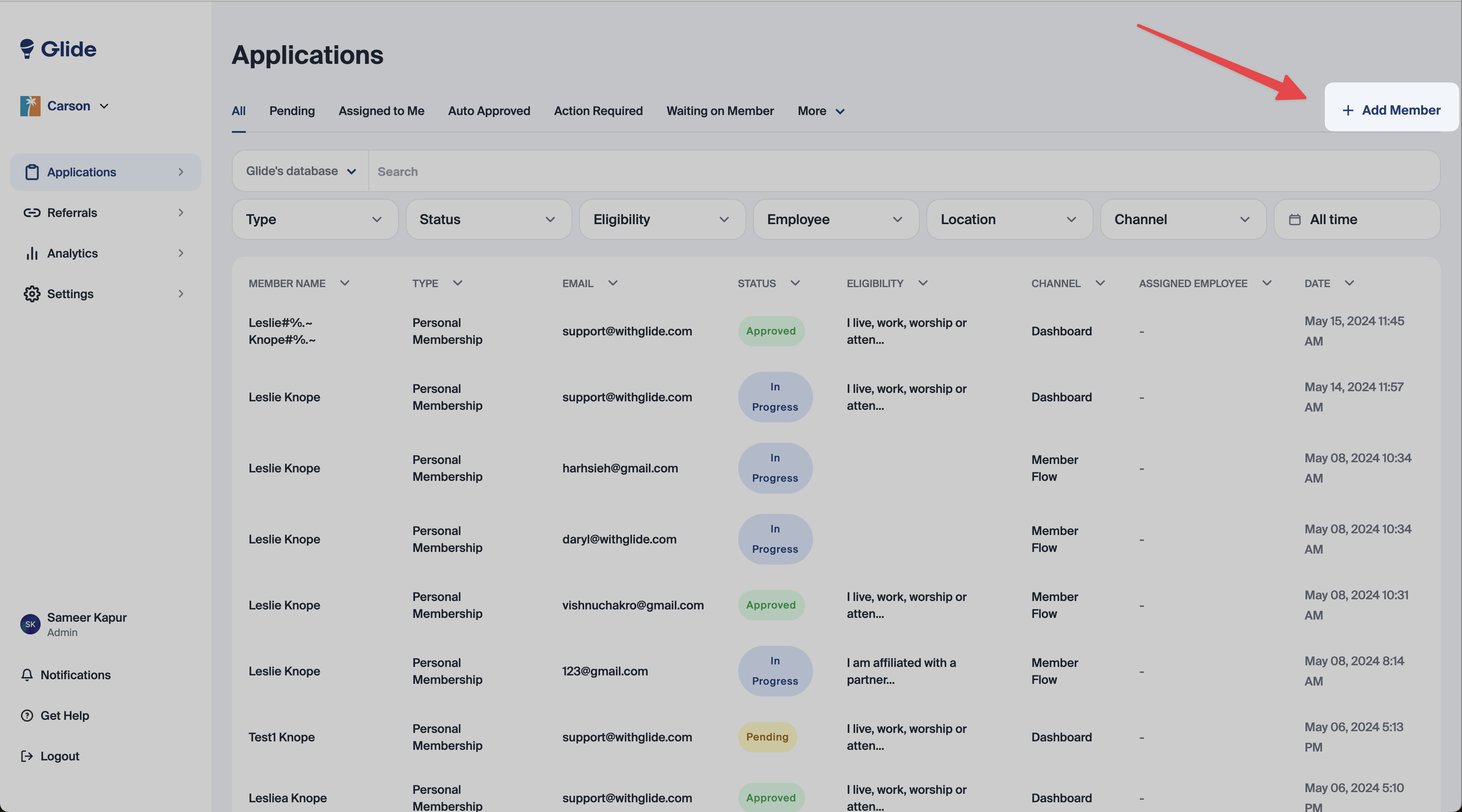 Start by clicking the “+Add Member” button on the top right of the applications page.