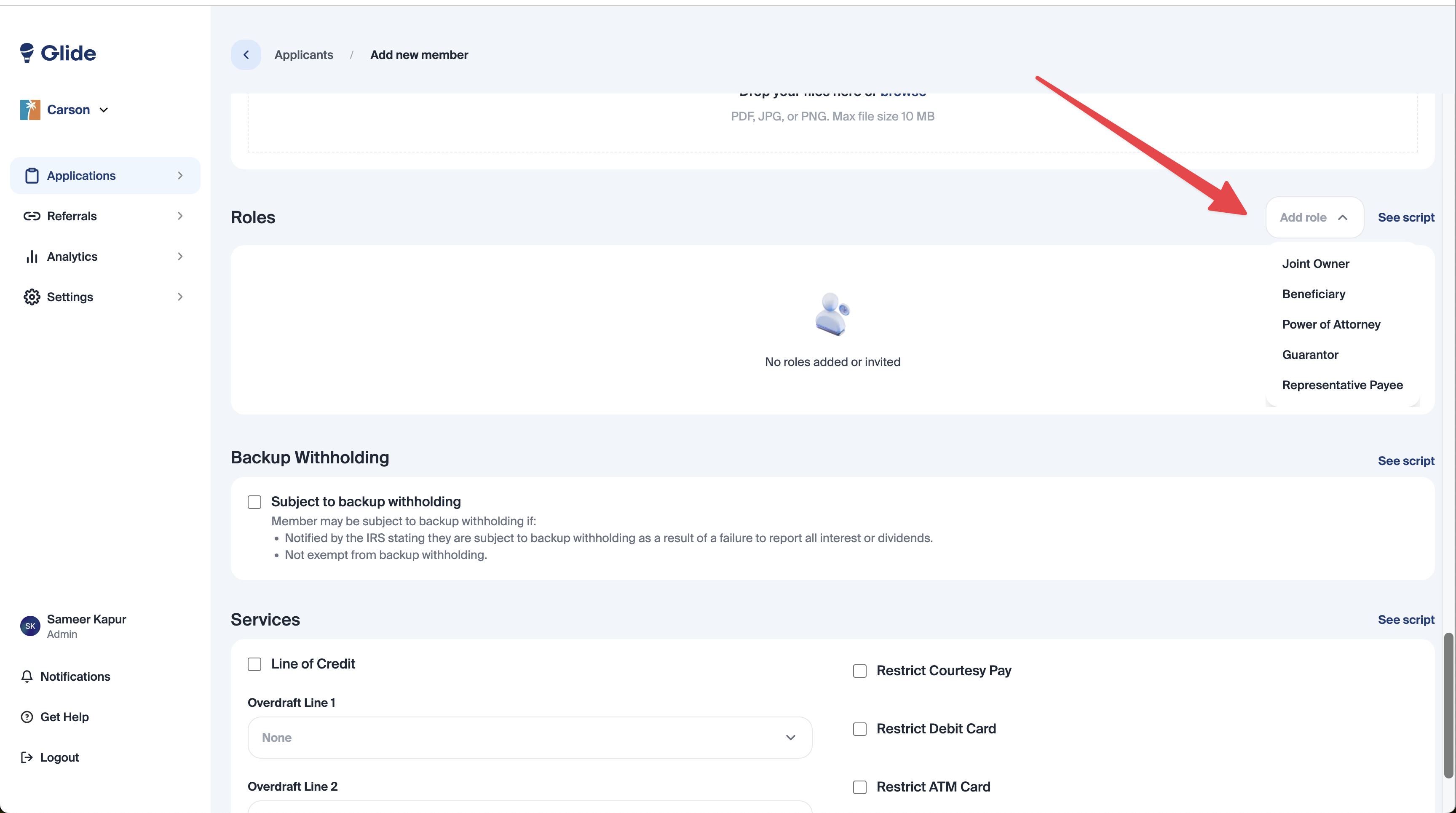 If additional roles (joints, beneficiaries, etc) would like to be added to the application use the “roles” table. The journey for adding these roles is similar to adding the primary applicant.