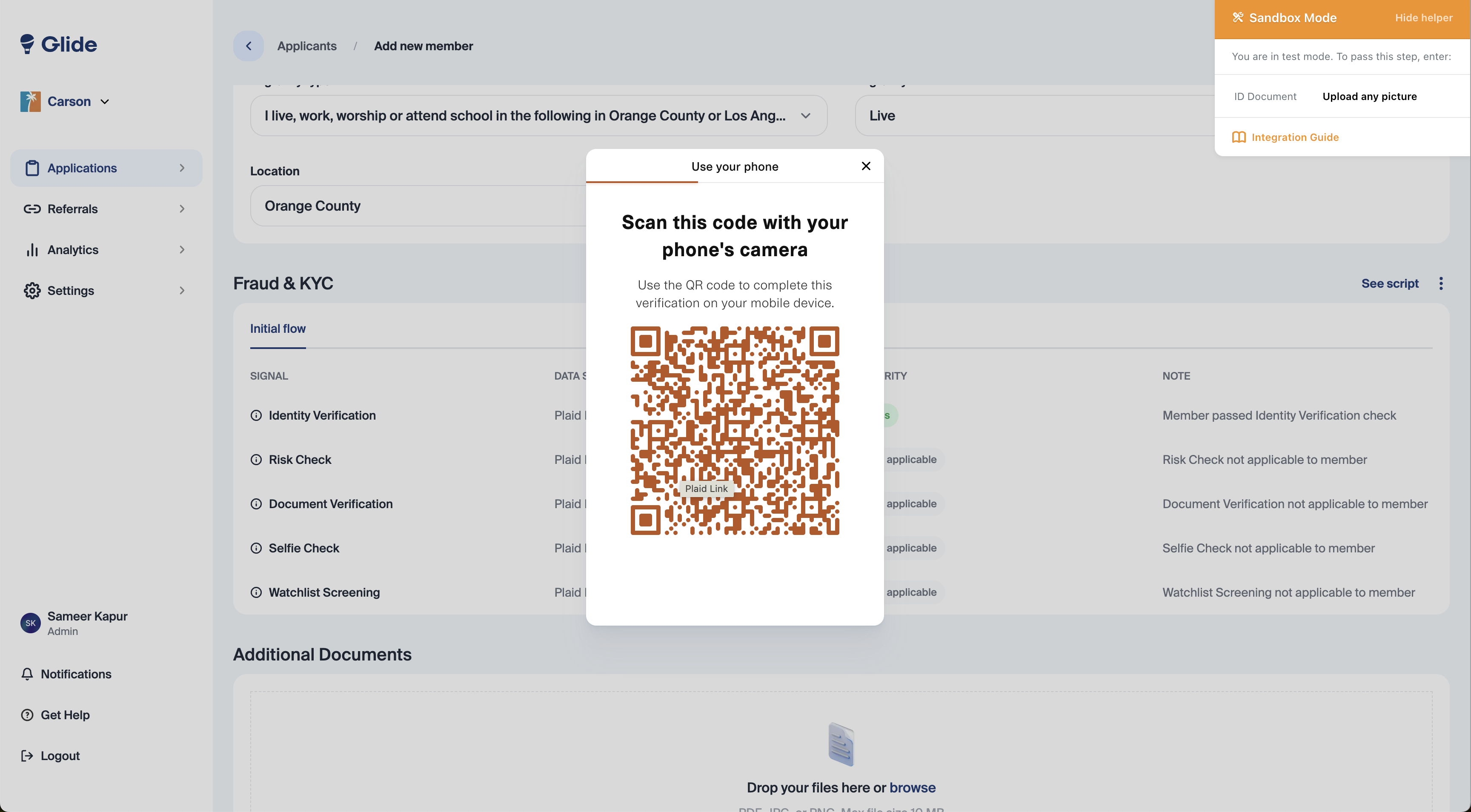 This this useful if you have already collected a photo of their ID (perhaps via a growth team event) and would just like to run the identity verification, risk, and OFAC watchlist checks without scanning a photo of their ID. If you already have a photo of their ID, upload it in the “Additional Documents” box below. “Run KYC check only” may also be useful for minors who do not have an official ID document.
