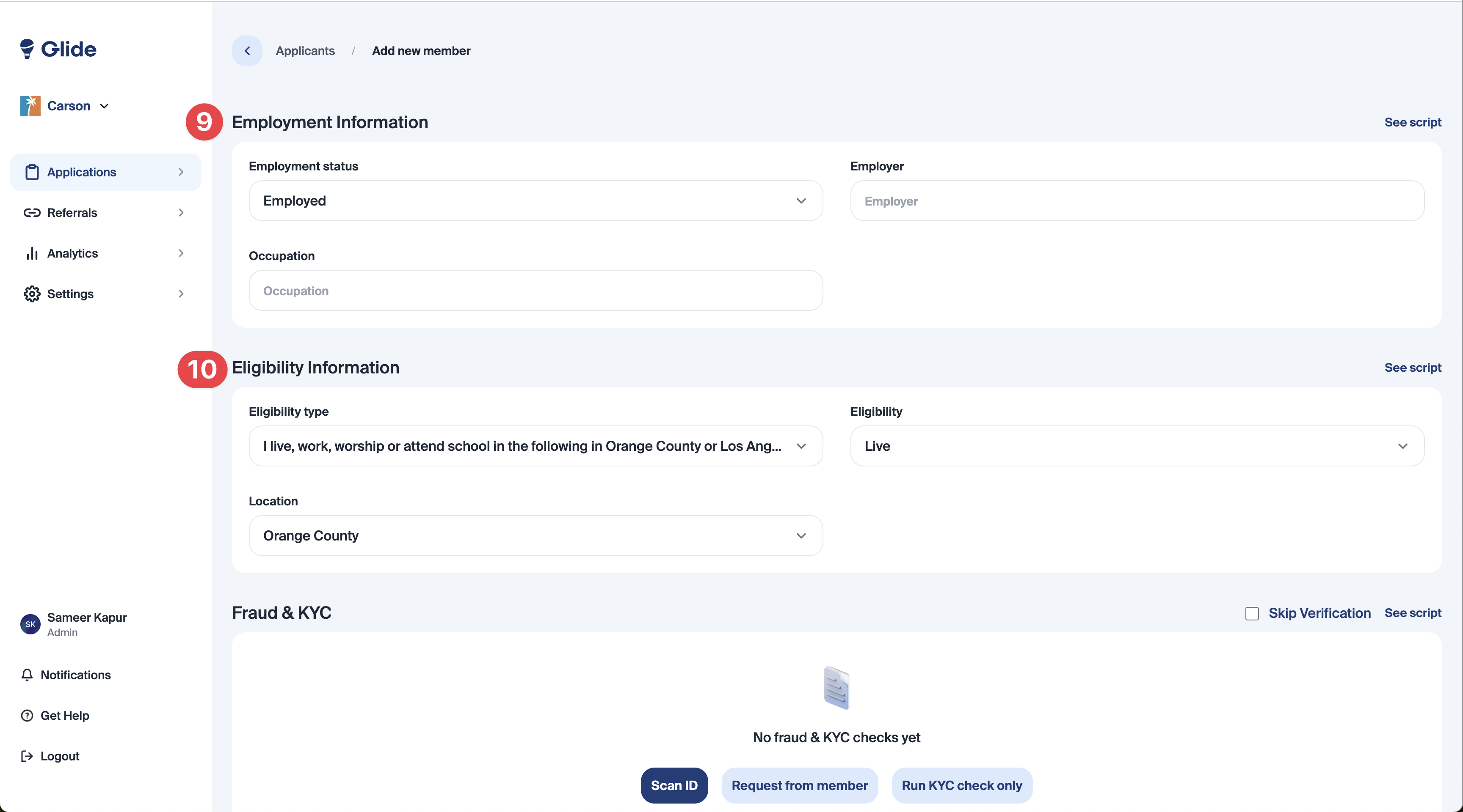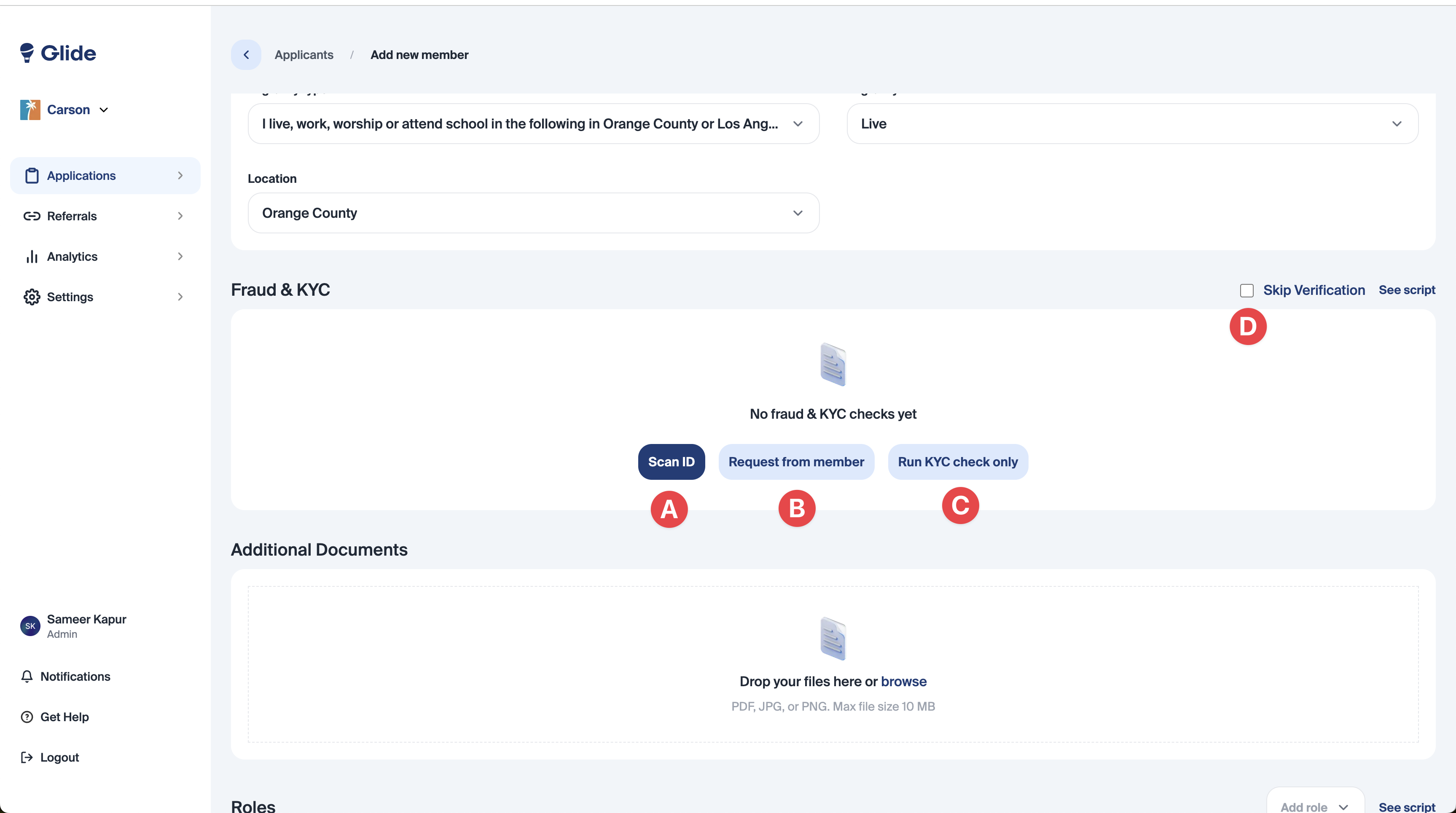 In the Fraud & KYC section, there are four options: Scan ID, Request from member, Run KYC check only, and Skip Verification.