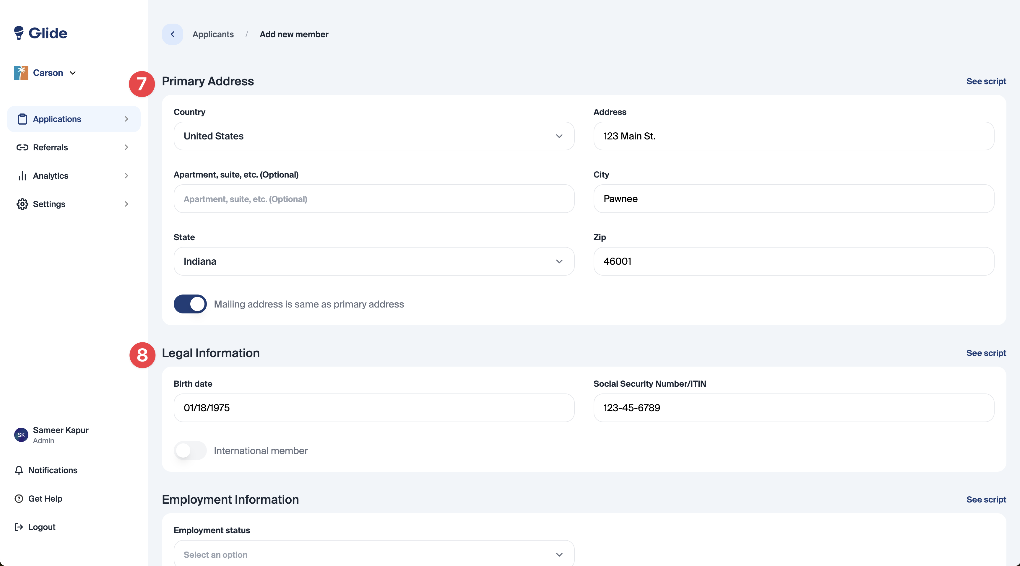 Enter the applicants Primary Address (7). If they have a separate mailing address, unselect the toggle for “Mailing address is same as primary address” and enter mailing address.