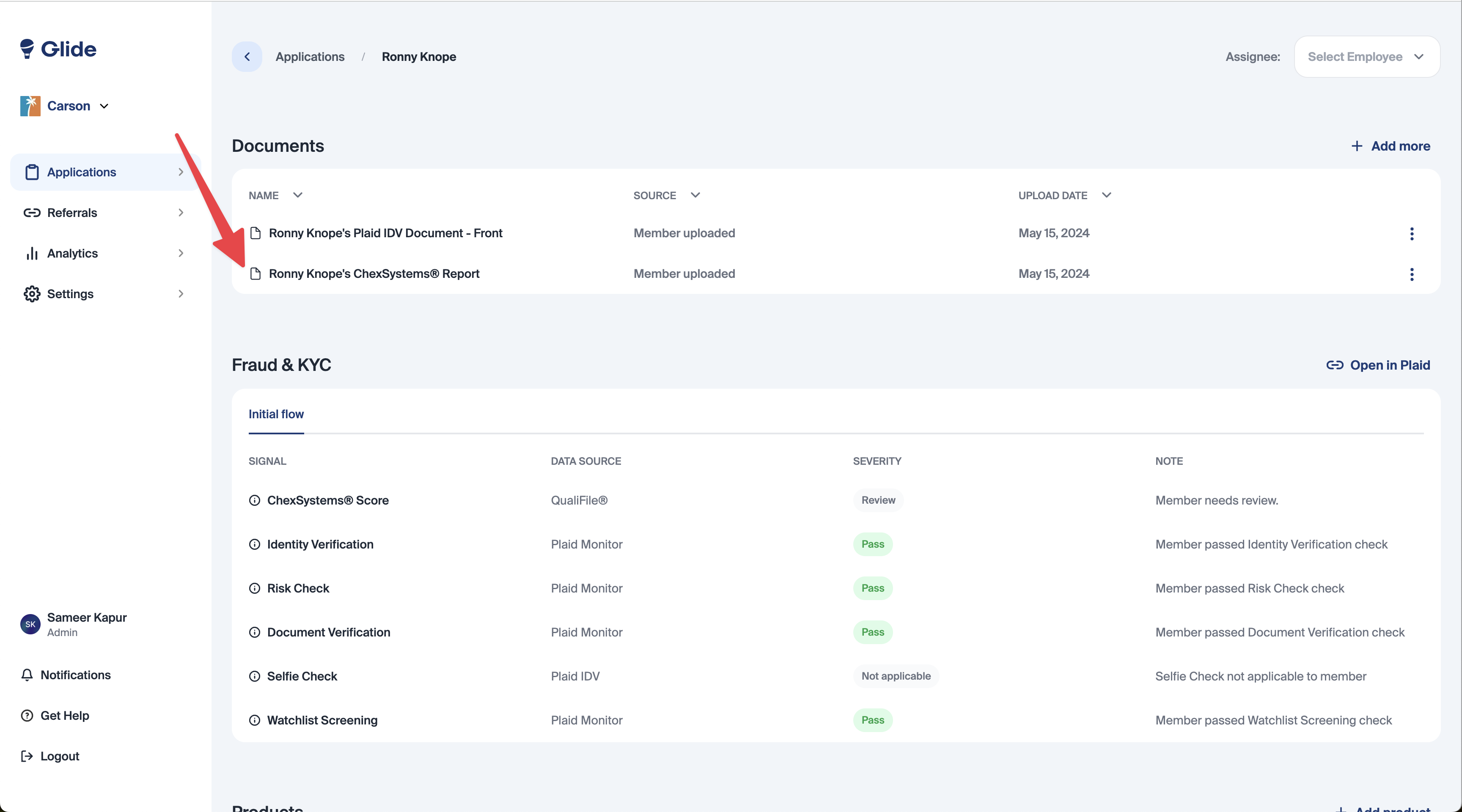 Once on the application is submitted, ChexSystems will automatically run. Click on the Document icon in the Documents table to view the ChexSystems report.