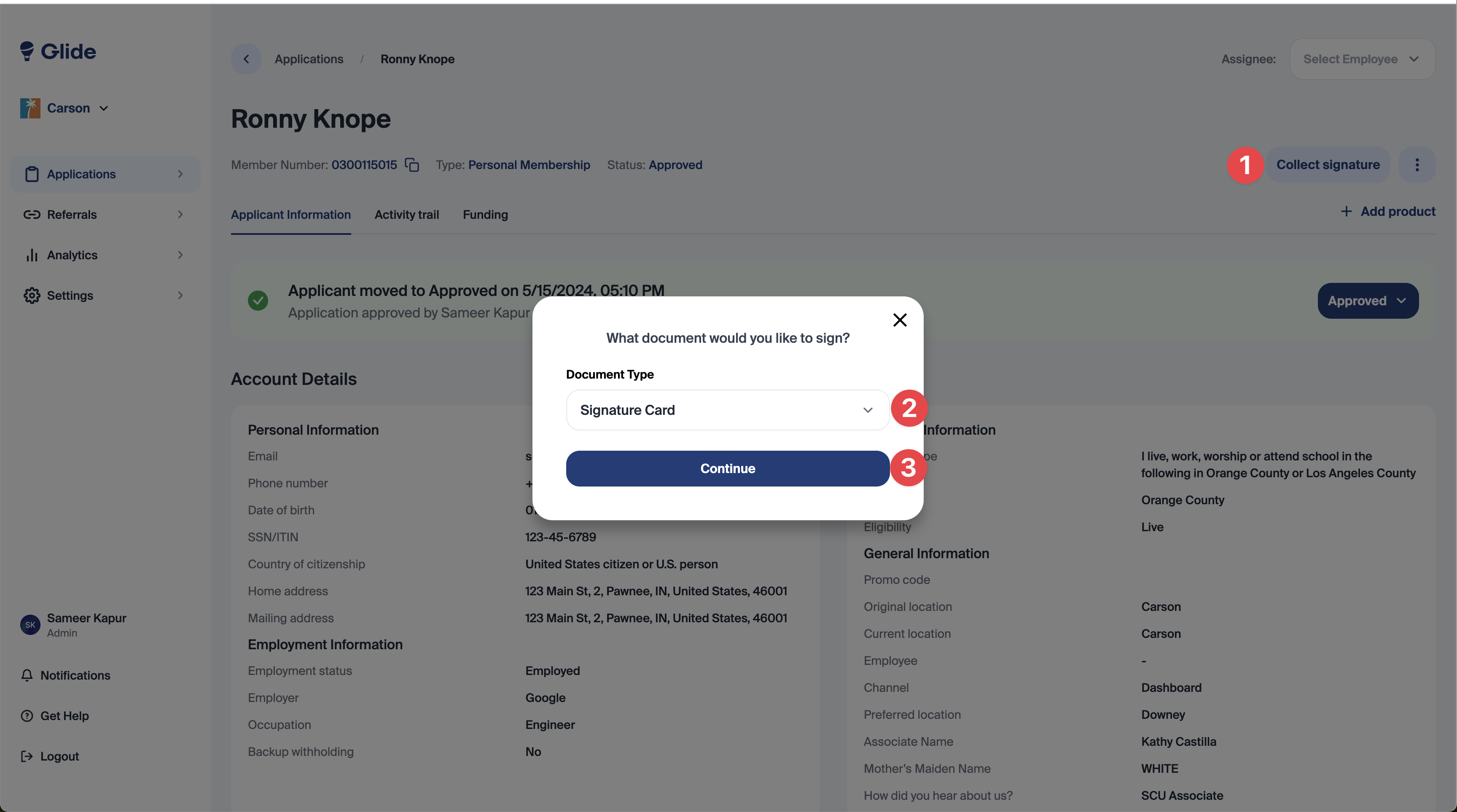 After an application has been approved, use the “Collect Signature” button to capture the members signature using a signature pad. Select the document type and click continue. After capturing the signature, the document will automatically appear in the documents section and be sent to your document storage system.