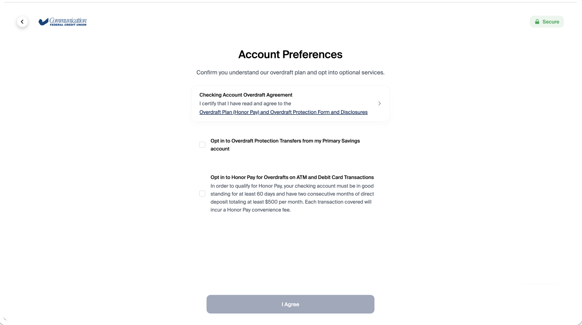 Overdraft agreement selections are opt-in only (unchecked by default). An opt-out checkbox pattern is not supported.