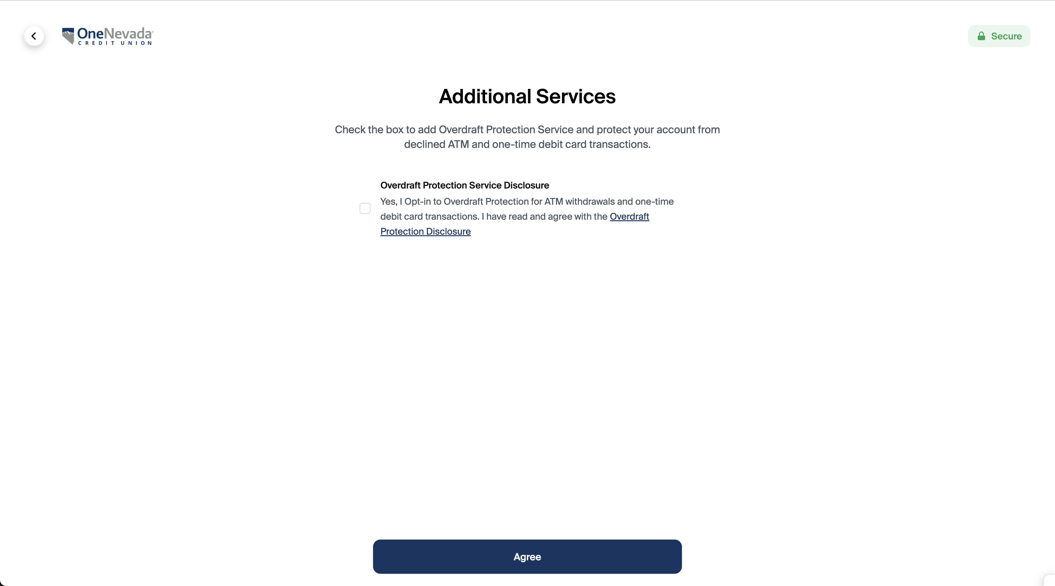 In this example, the credit union included overdraft protection in their regular disclosures and presents one optional selection for Overdraft Protection for ATM withdrawals and one-time debit card transactions.