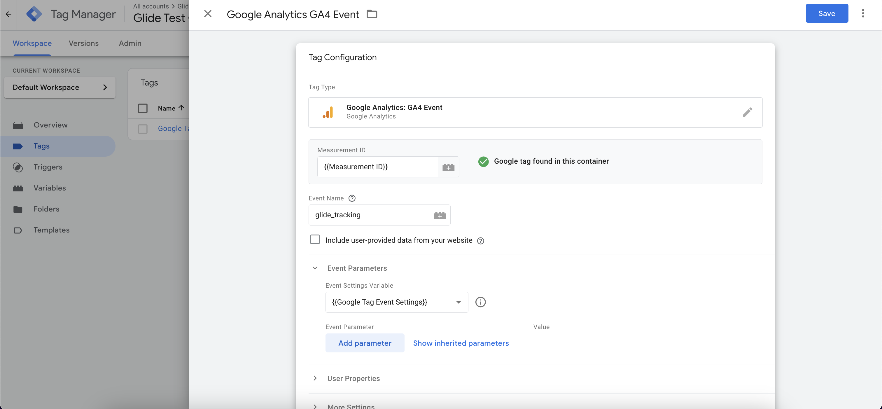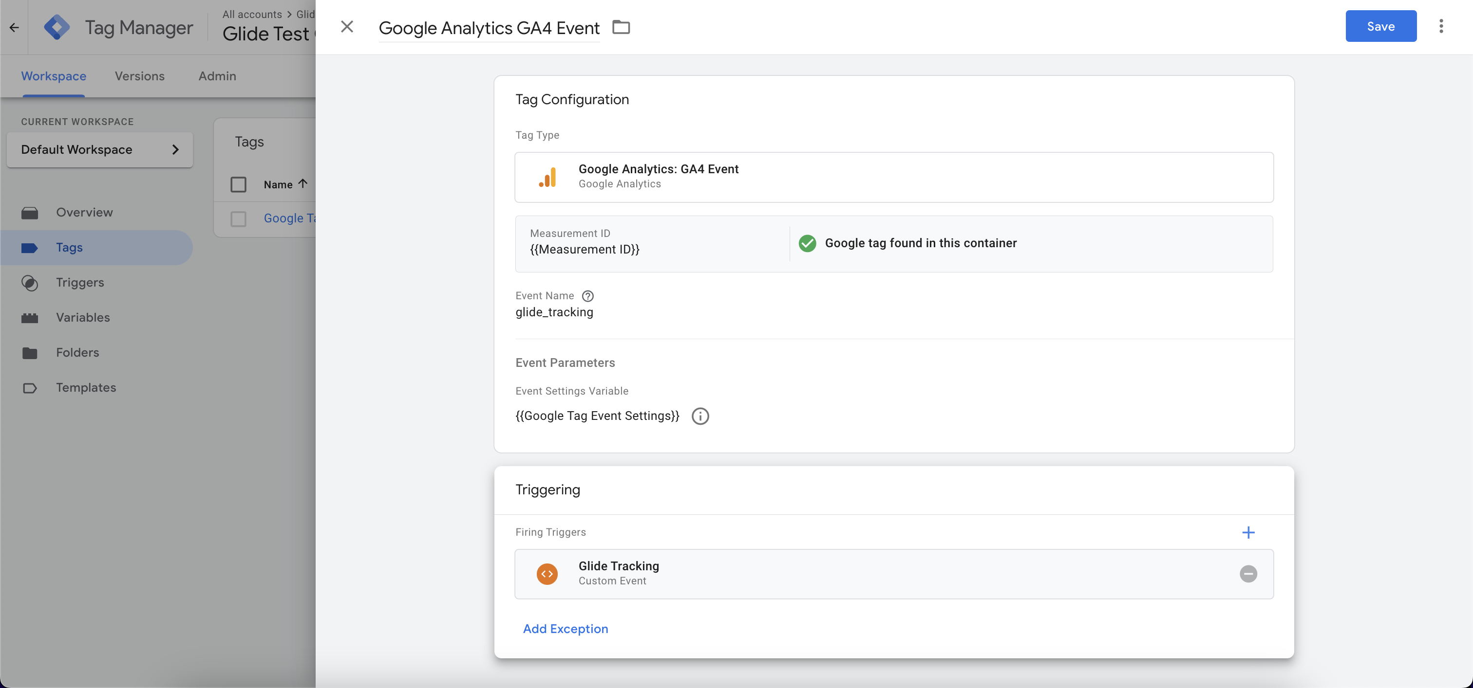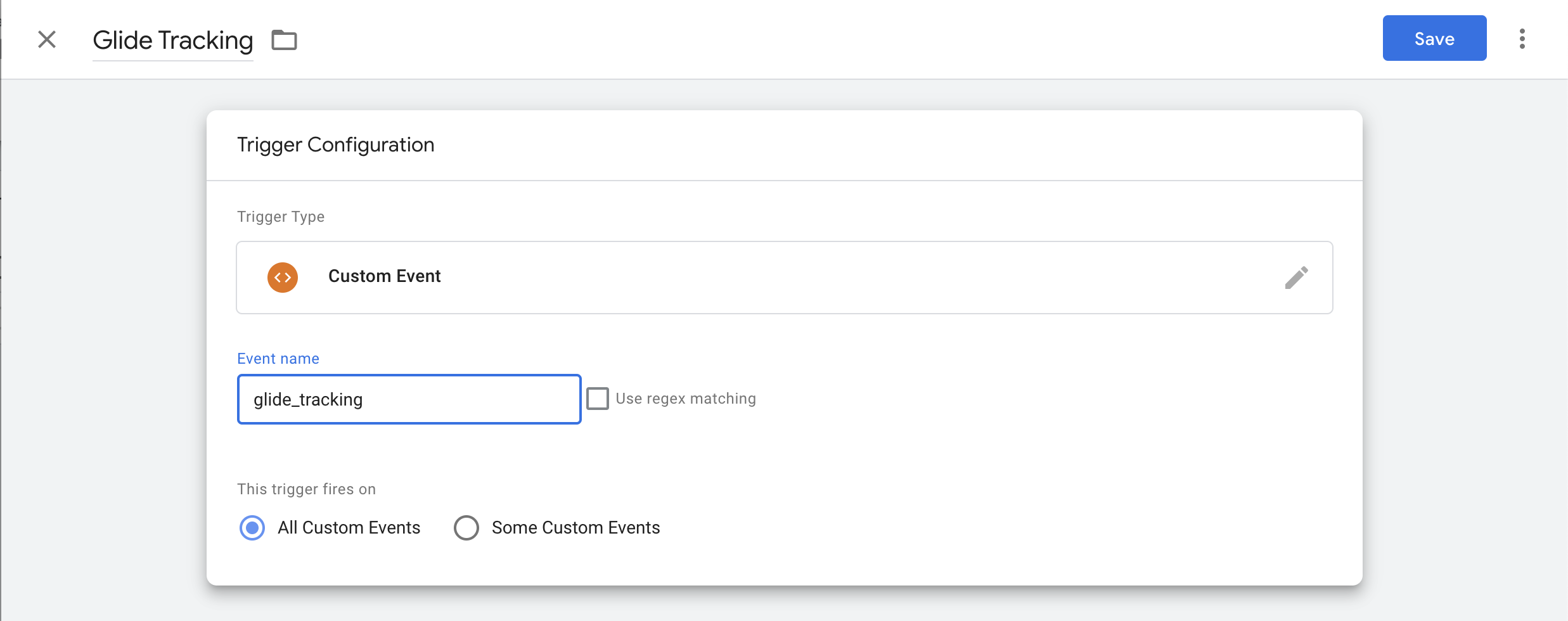 e. Click on Triggering > Select Glide Tracking (custom event) that you’ve created in “Create Custom Trigger” step