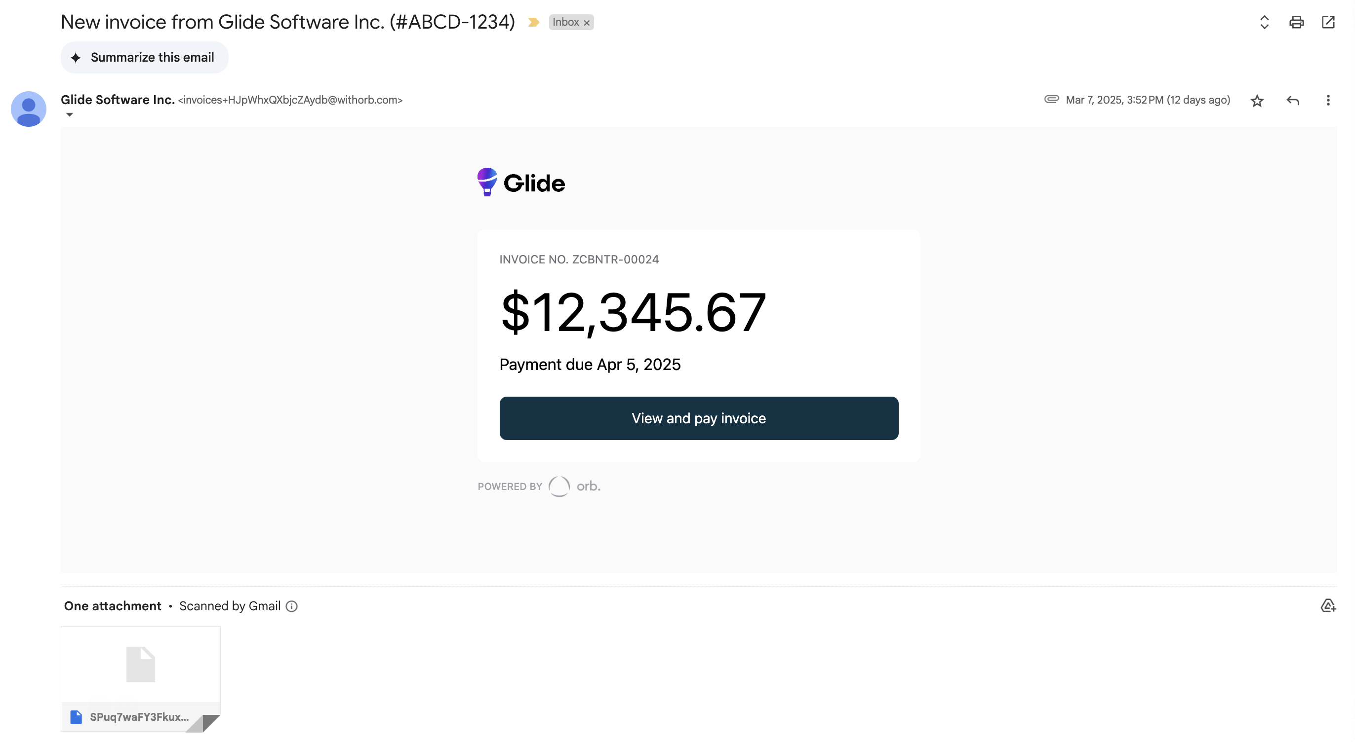 Invoice notifications will be sent from: invoices+HJpWhxQXbjcZAydb@withorb.com. The invoice email will appear as follows and will include a PDF of the invoice: