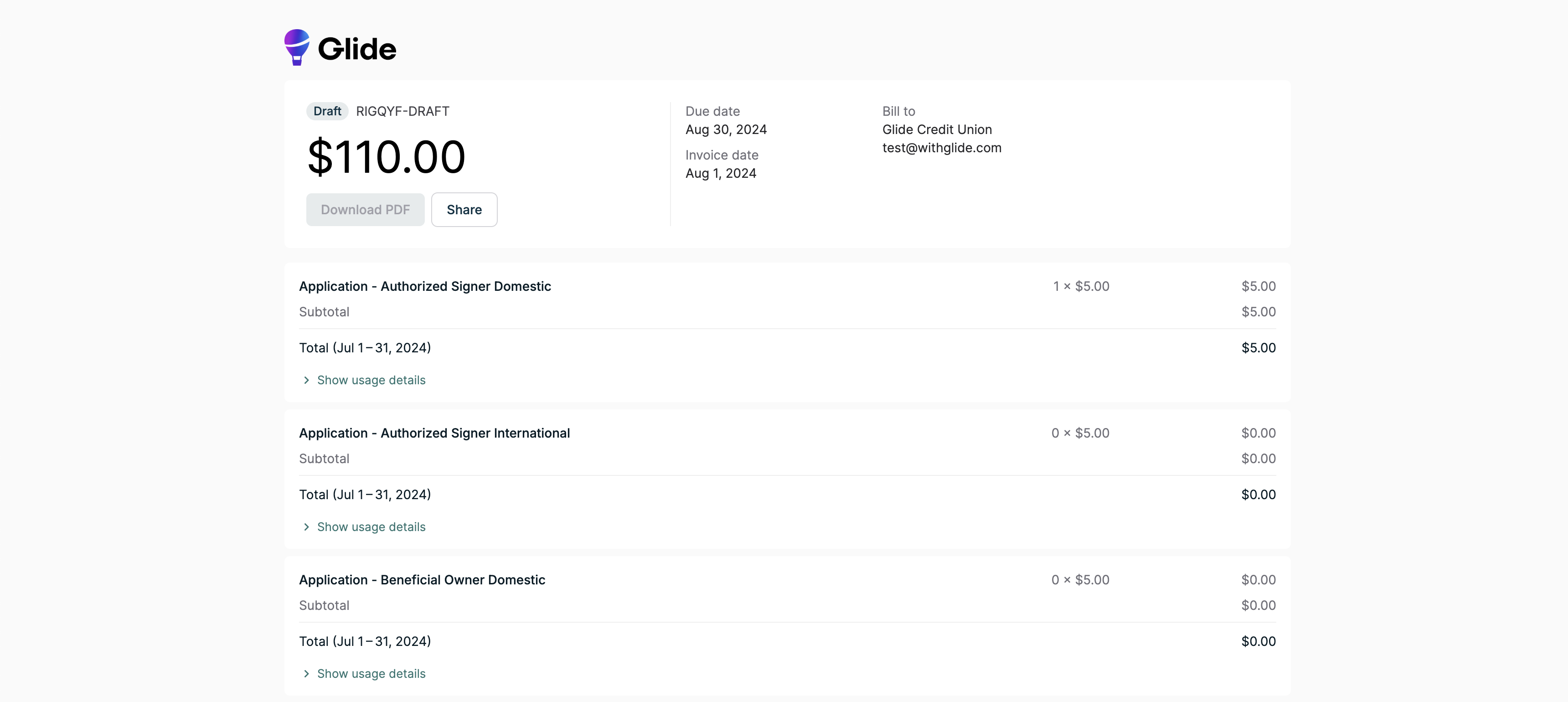 Glide prefers ACH payments when recieving fees from invoices as opposed to mailed checks.