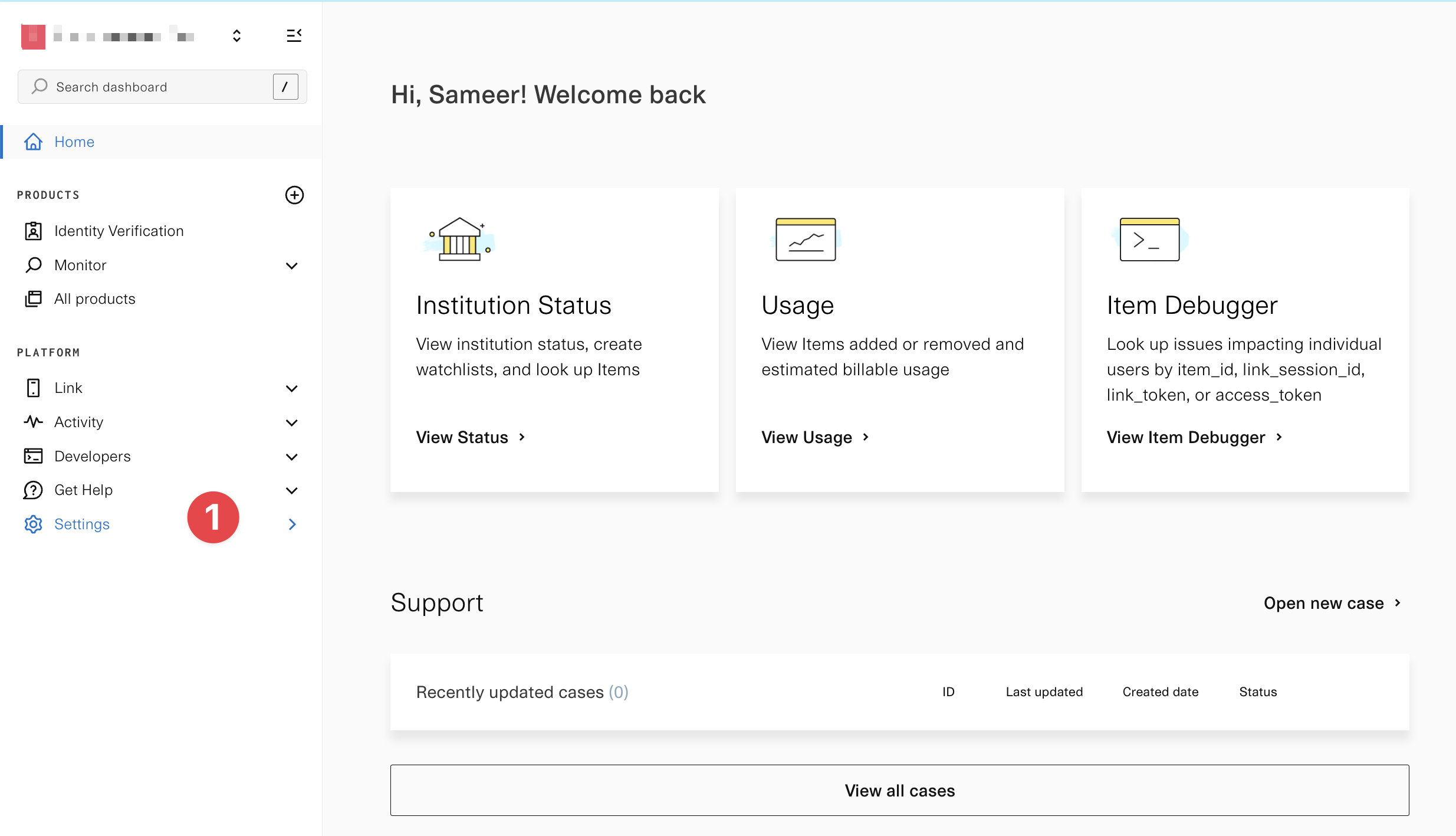 Start on https://plaid.com/ and use the log in button on the top right to log into your dashboard.