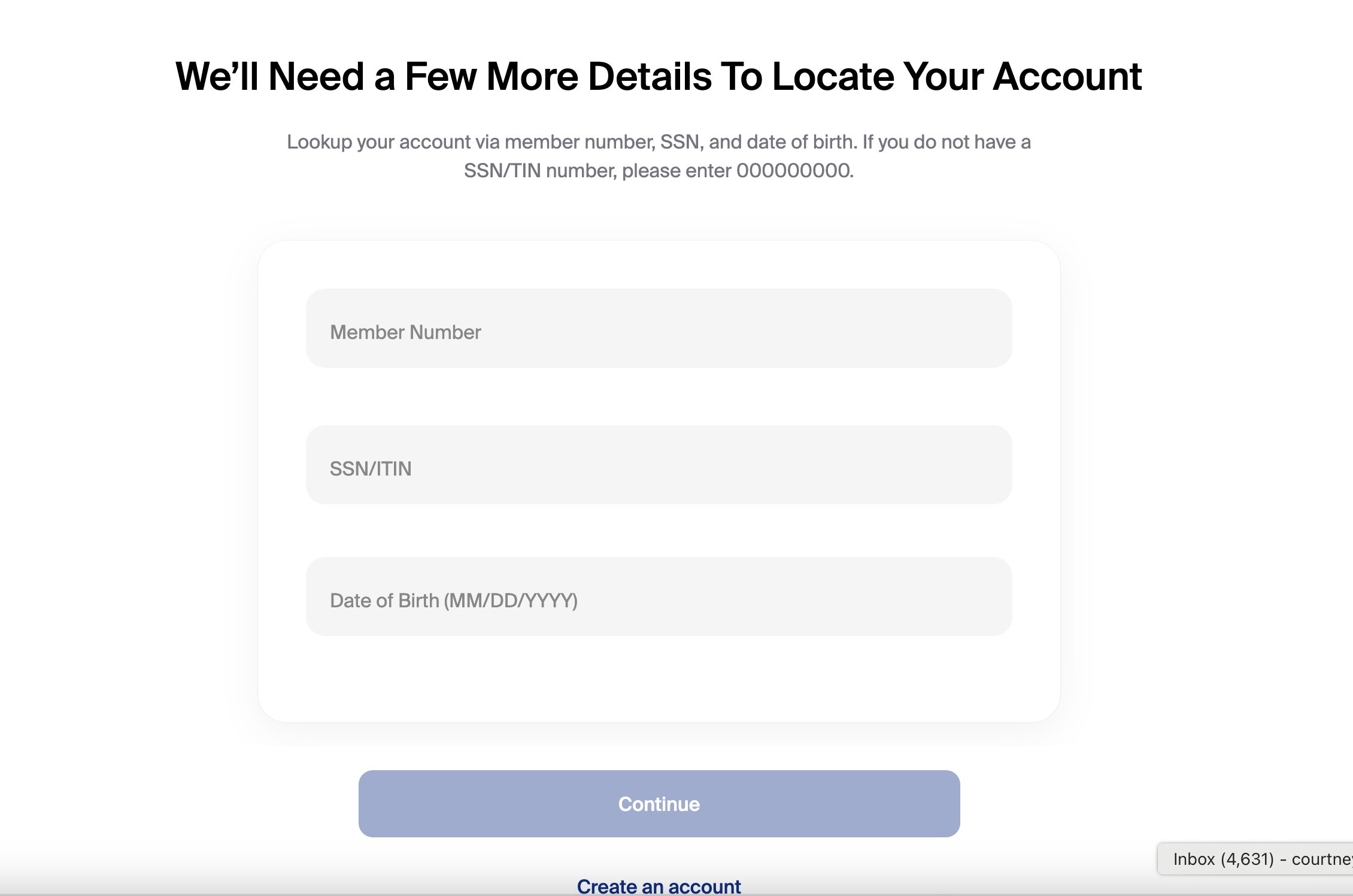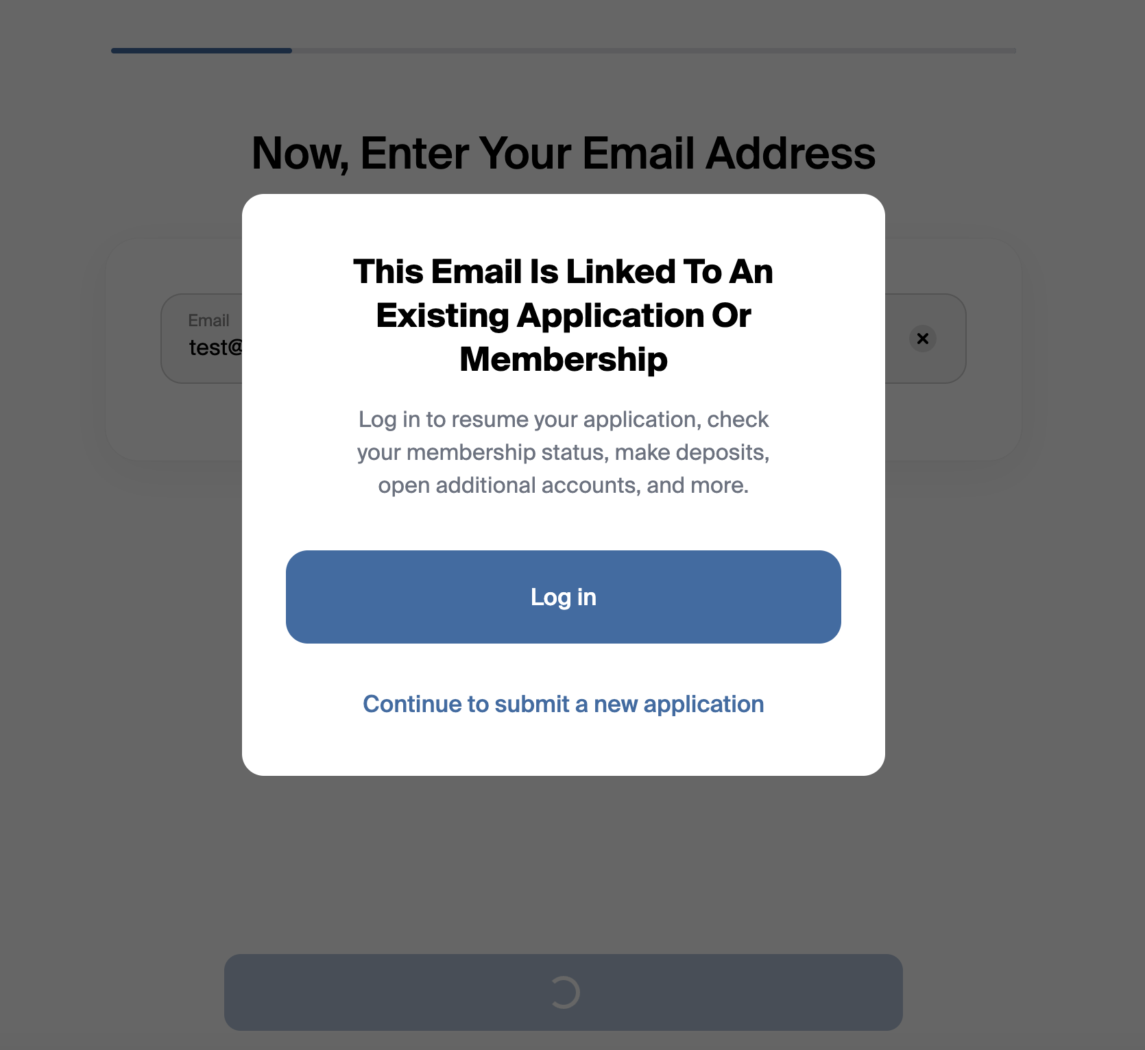 If a member begins the account opening workflow and enters an email address that matches an existing application or membership, they will be prompted to either: