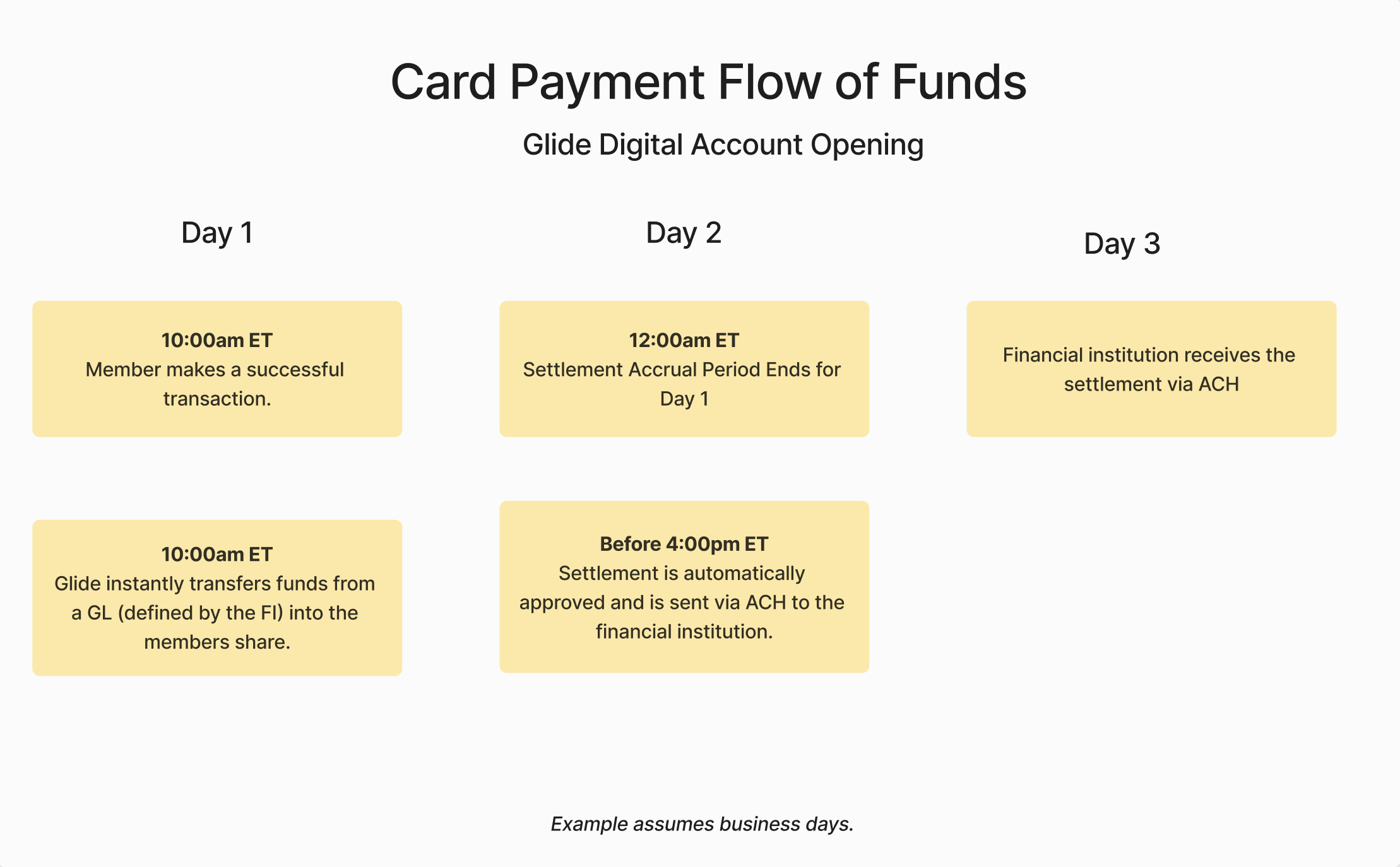 Financial institutions can specify which GL account is used to transfer funds when a member completes a successful transaction (see Day 1 in the example above).