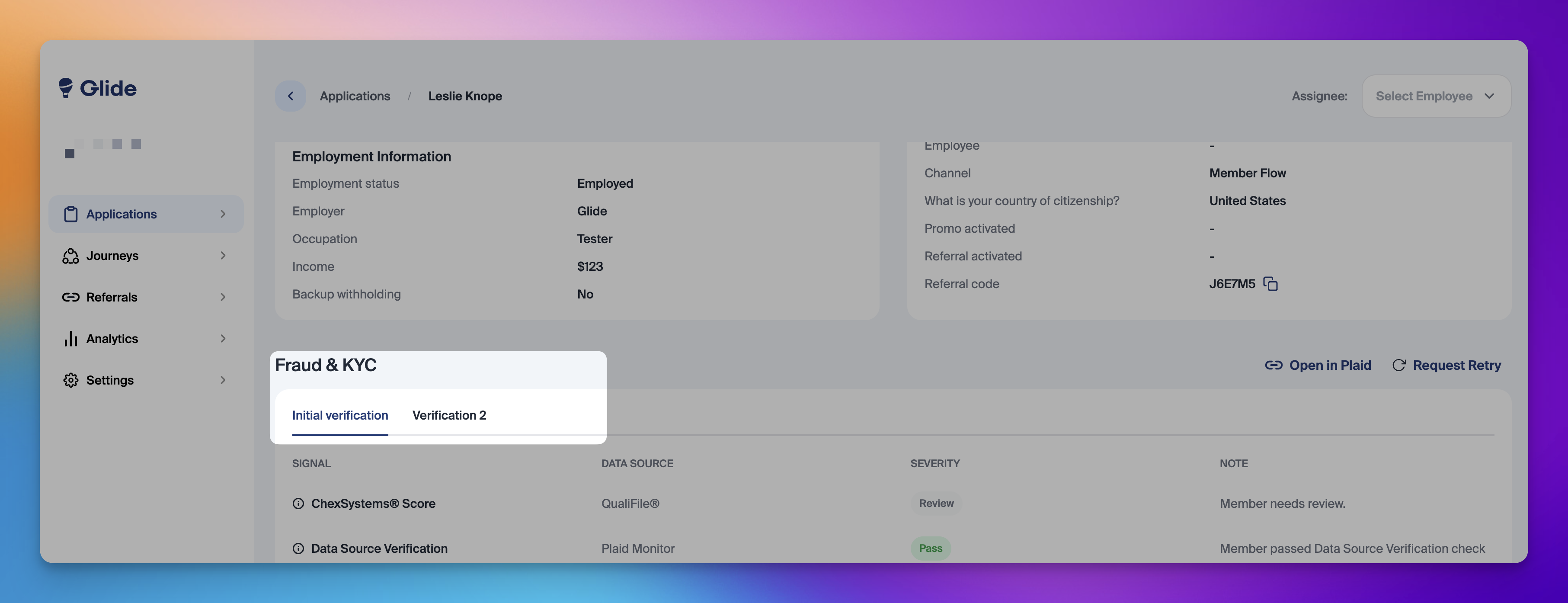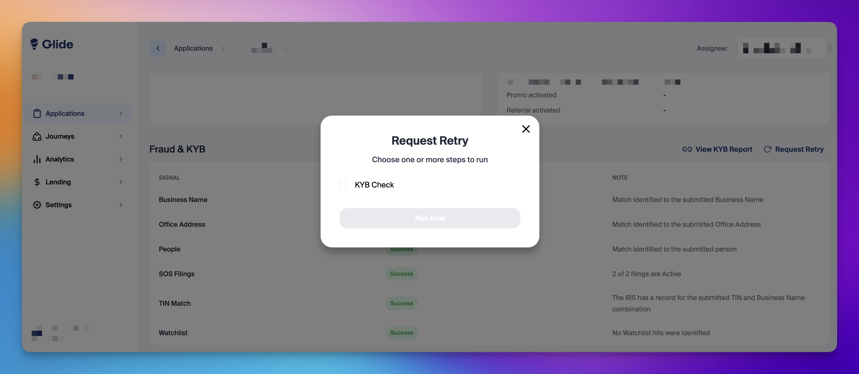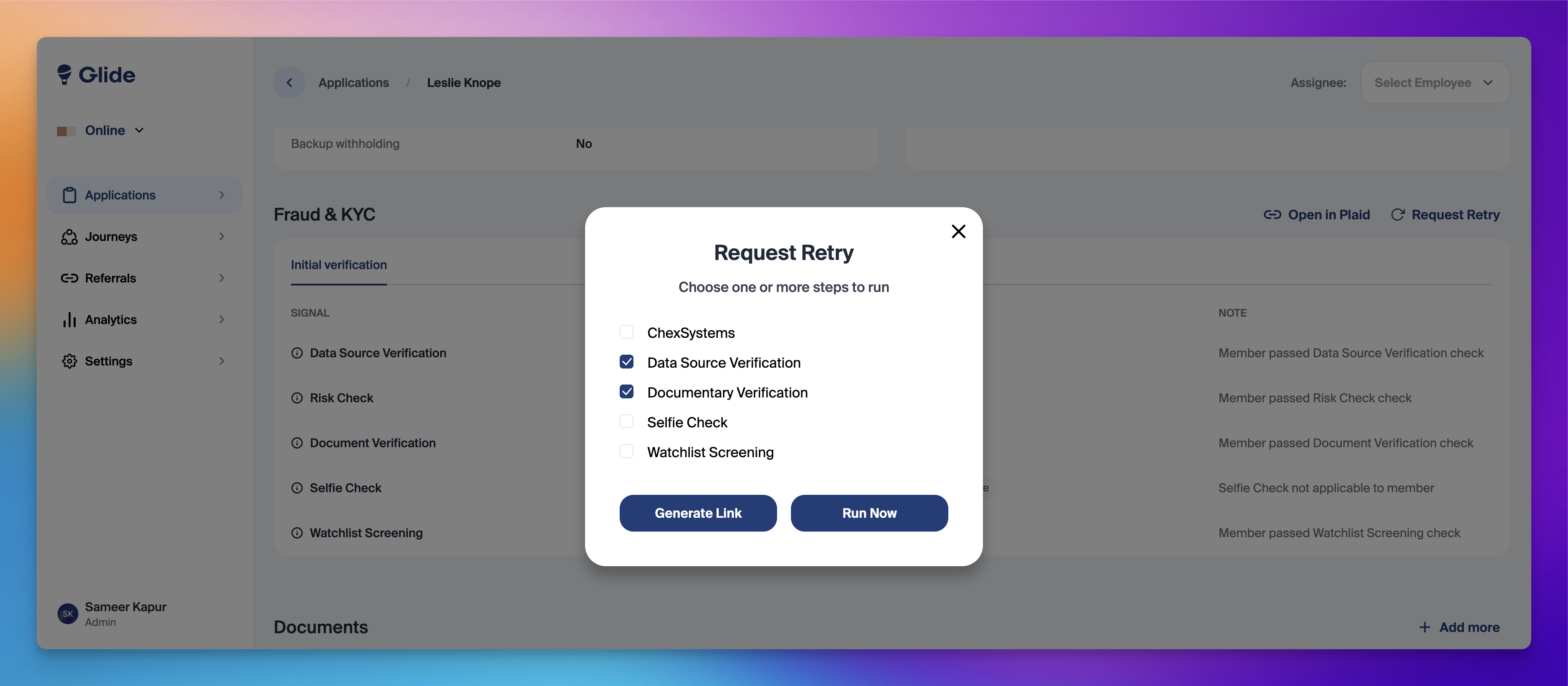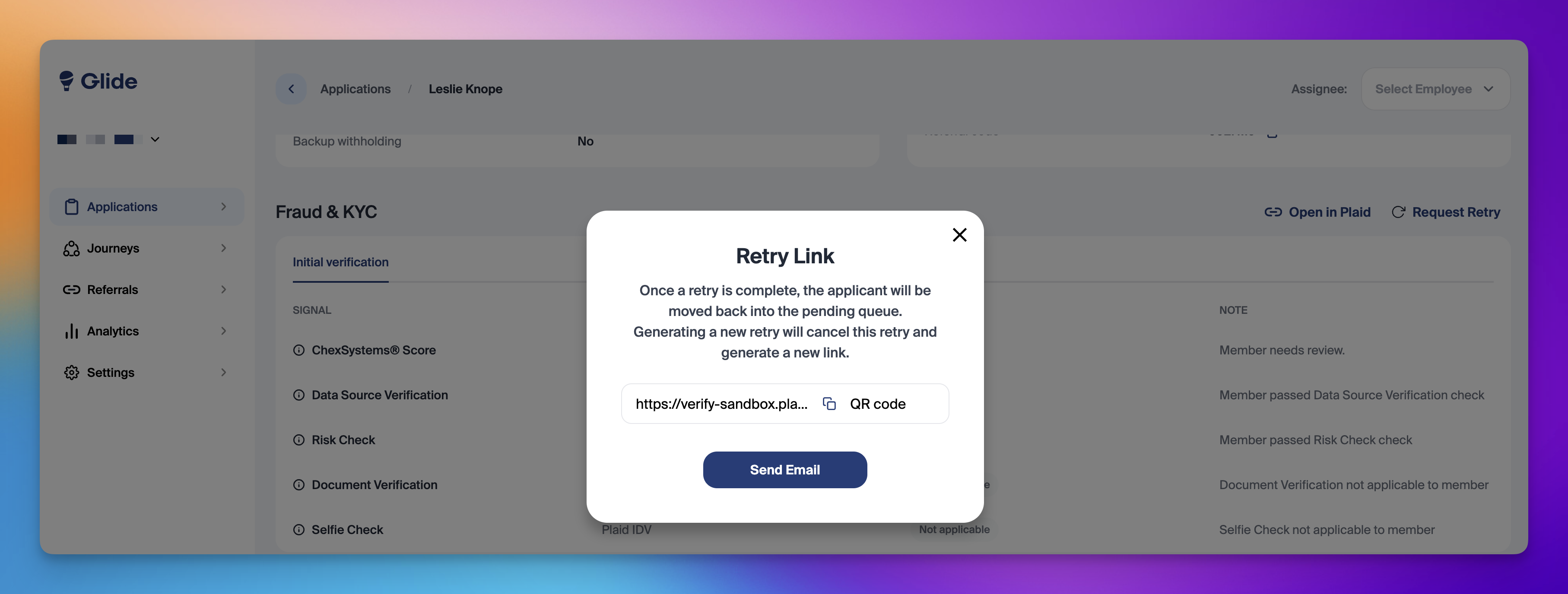 Glide's request retry feature allows staff to initiate Fraud & KYC retries directly from the dashboard. With just a few clicks, staff can quickly send an email to the member—whether it’s for correcting mistyped information, completing documentary verification, or attempting a selfie check.