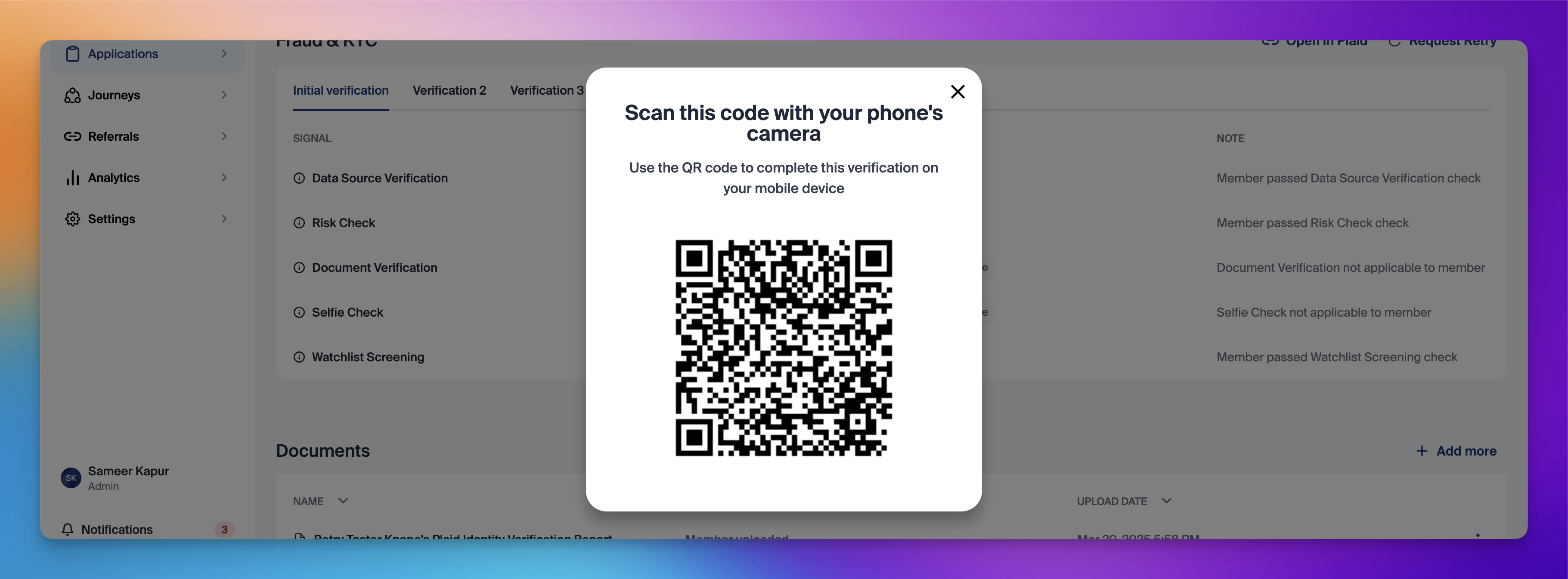 Clicking "Run Now" if a retry is requested for Documentary and Selfie check will bring up a QR code meant to be scanned with a phone's camera. After scanning the QR code, the applicant can complete the Documentary Check (by scanning their ID documents) or selfie check (by taking a selfie). Initiating a retry with Documentary and Selfie check is a great way to step up a member to additional verification if their initial screening resulted in high risk. For more information on recomended step ups, see our Identity Verification Procedures guide.