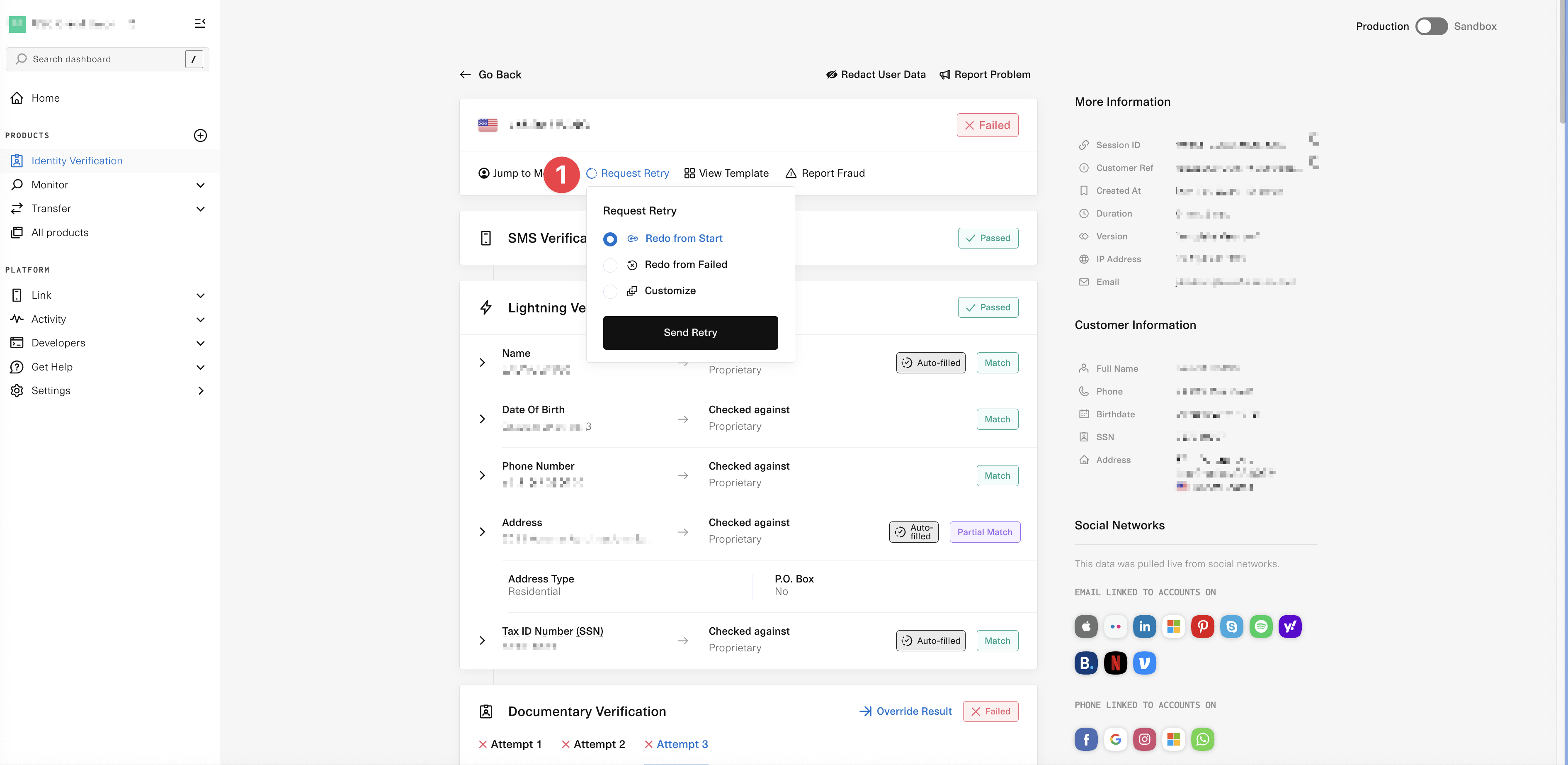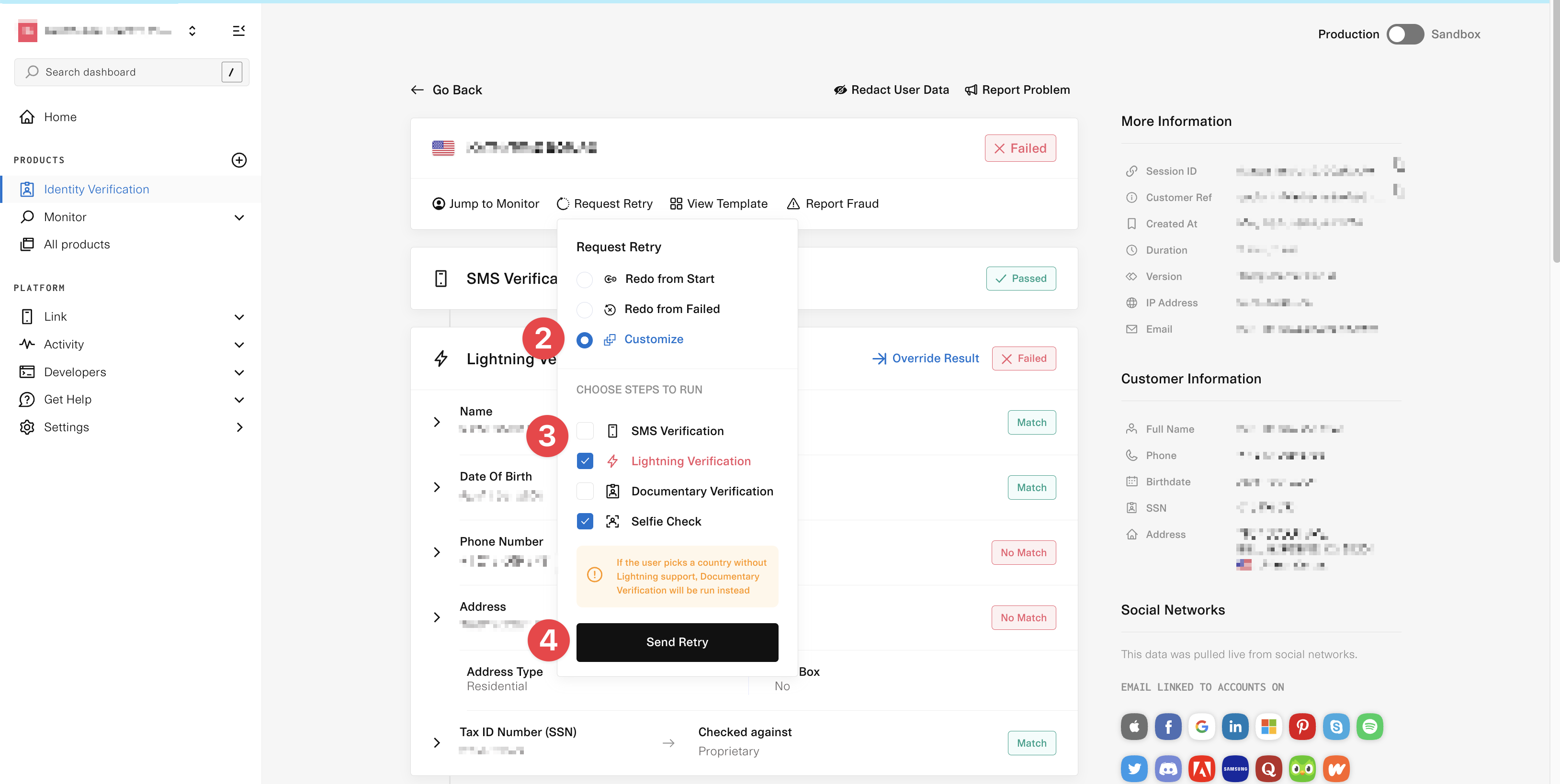 Next, click “Customize.” Then, select the retry steps you’d like to run. If there are multiple failures, create a retry that combines all of the additional checks and send to applicant. Finally, select “Send Retry.”