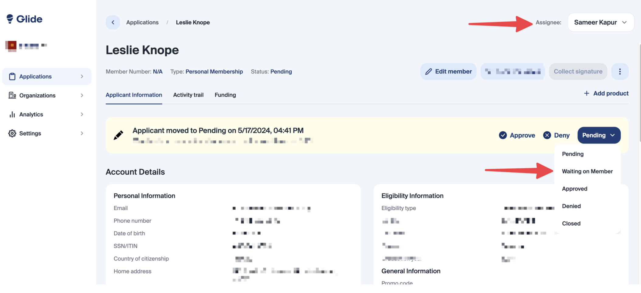 Ensure that you previously changed the applicant assignee to your name. Then, change the status of the applicant from Pending to “Waiting on member”