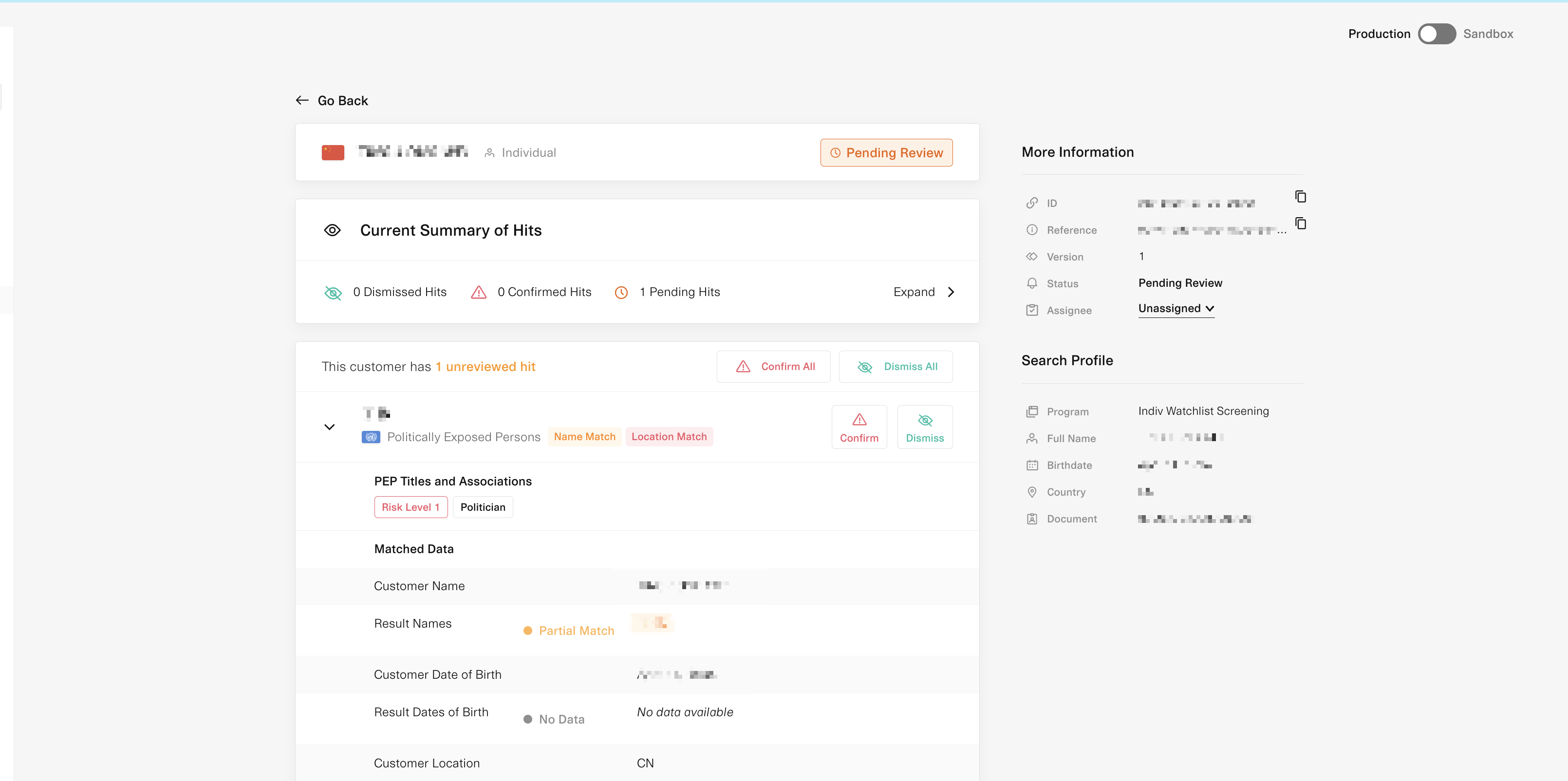 You’ll be taken to the Plaid Monitor view. On this page, you can analyze the hit deeper and confirm or dismiss the hit. Plaid will state what attributes of the member matched with a hit and the list that the member was found on.