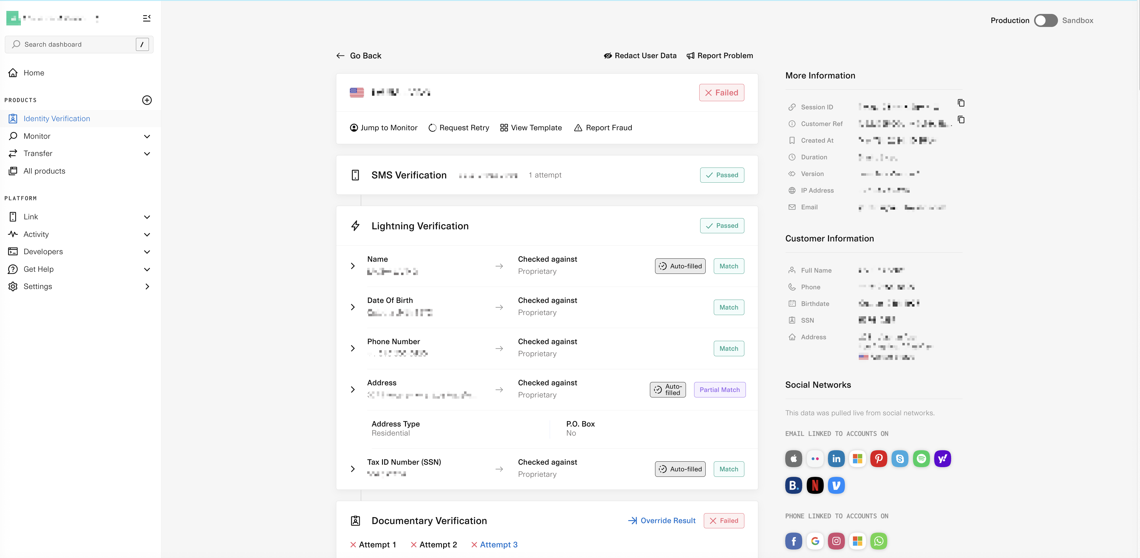 Plaid IDV conducts an identity check on the applicant by comparing their PII with authoritative data sources (see Fraud Prevention Overview for more info).