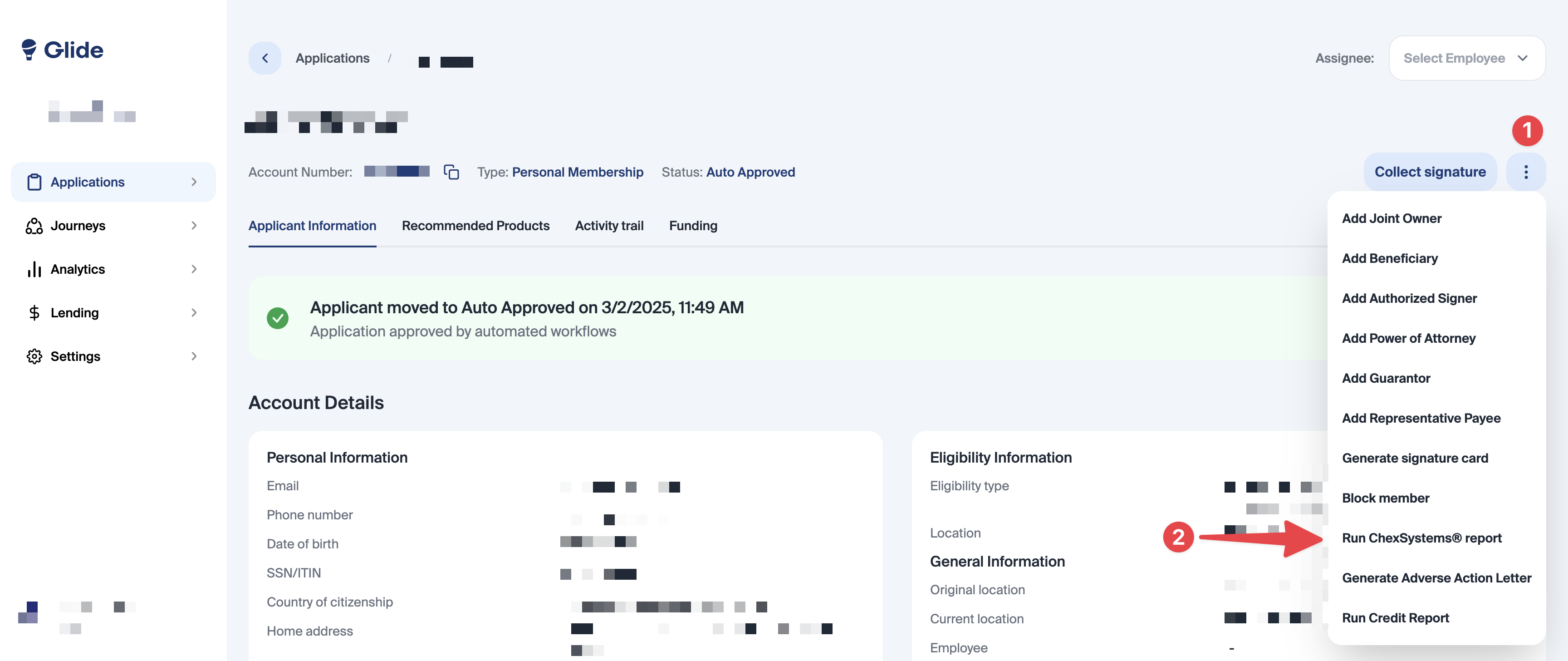 Skip for existing checking accounts – If the member already has a pending or approved checking account (whether added via Glide or pre-existing), ChexSystems will not automatically run for additional checking accounts.